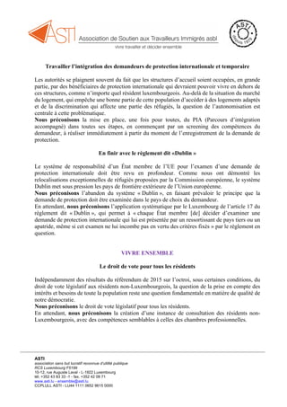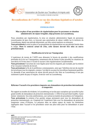 L'ASTI recommande plusieurs réformes pour améliorer l'immigration et l'intégration des migrants au Luxembourg, y compris une procédure de régularisation pour les personnes sans autorisation de séjour, la modification de la loi sur l'immigration, et des réformes du système d'asile. L'association plaide également pour le droit de vote pour tous les résidents, l'élargissement du congé de bénévolat, et la création d'un observatoire contre le racisme et la xénophobie. Enfin, l'ASTI appelle à la création d'une chambre des citoyens pour mieux représenter les divers intérêts de la population.