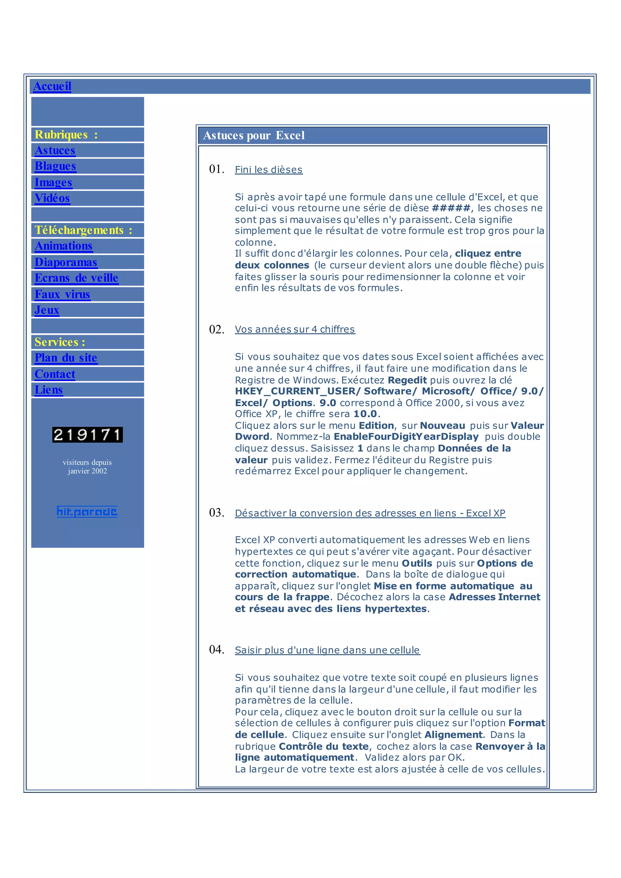 Le document fournit des astuces et conseils sur l'utilisation d'Excel et d'Outlook Express, y compris des méthodes pour gérer des formules, personnaliser des graphiques et automatiser certaines tâches. Il couvre des fonctionnalités comme la protection des fichiers par mot de passe, l'insertion rapide de lignes et la désactivation des liens hypertextes. Les utilisateurs peuvent également apprendre à organiser leurs courriels et à optimiser leur expérience avec Outlook Express.
