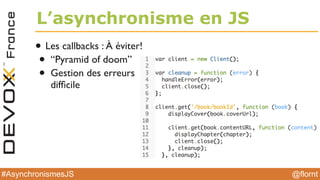 Le document traite de l'asynchronisme en JavaScript, abordant des méthodes telles que les callbacks, les promesses, et l'utilisation de générateurs avec 'yield'. Il souligne les avantages des promesses, notamment la gestion simplifiée des erreurs et la possibilité de chaîner les appels, tout en recommandant la librairie Bluebird pour ses performances. La conclusion met en avant l'importance de l'approche fonctionnelle dans le contexte de JavaScript.