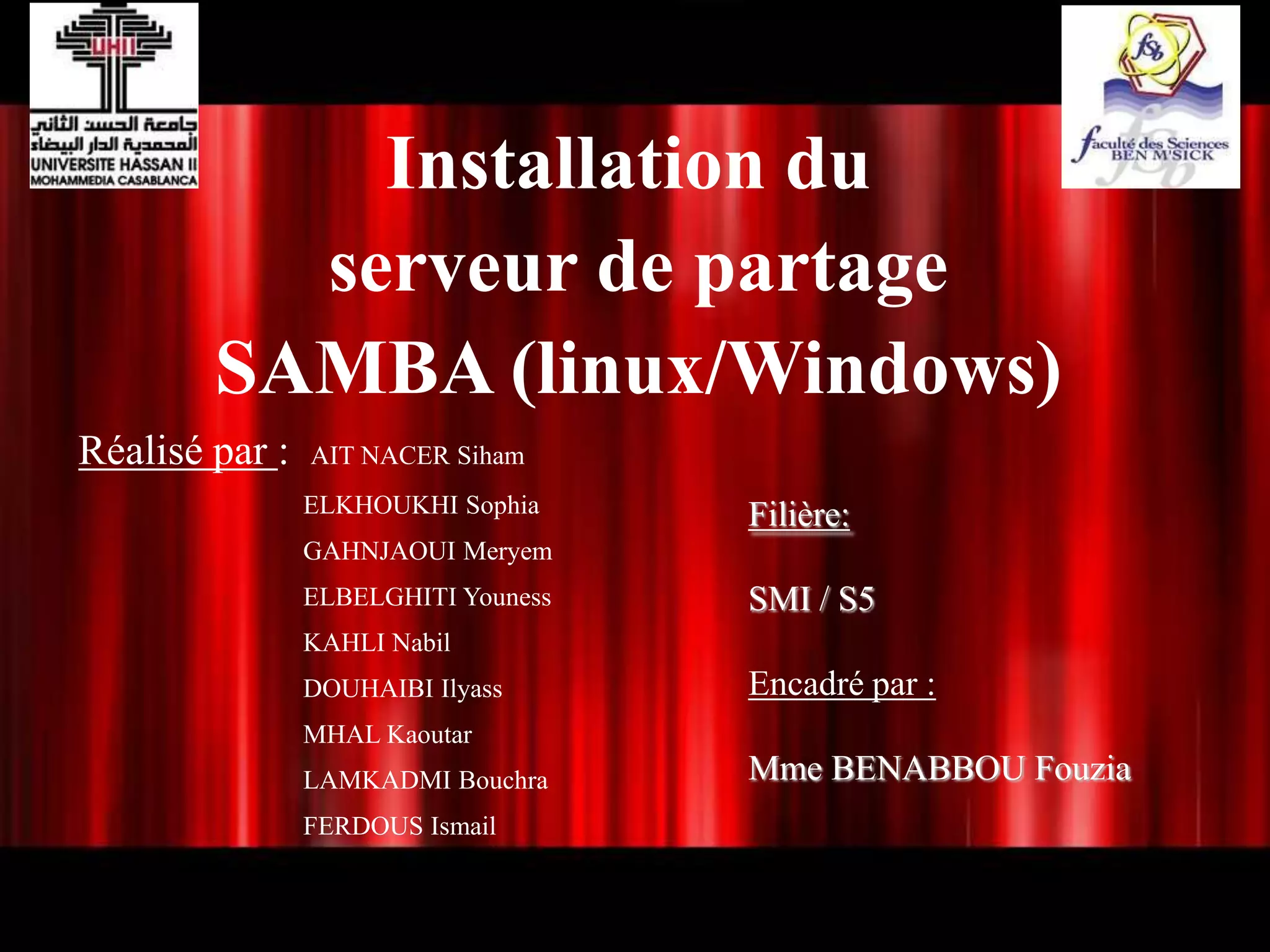 Le document présente l'installation et la configuration du serveur Samba, qui permet le partage de fichiers et d'imprimantes entre systèmes Linux et Windows. Il détaille l'architecture de Samba, le fichier de configuration smb.conf et les différentes options de partage. Samba facilite ainsi la communication entre les réseaux hétérogènes en utilisant le protocole SMB.