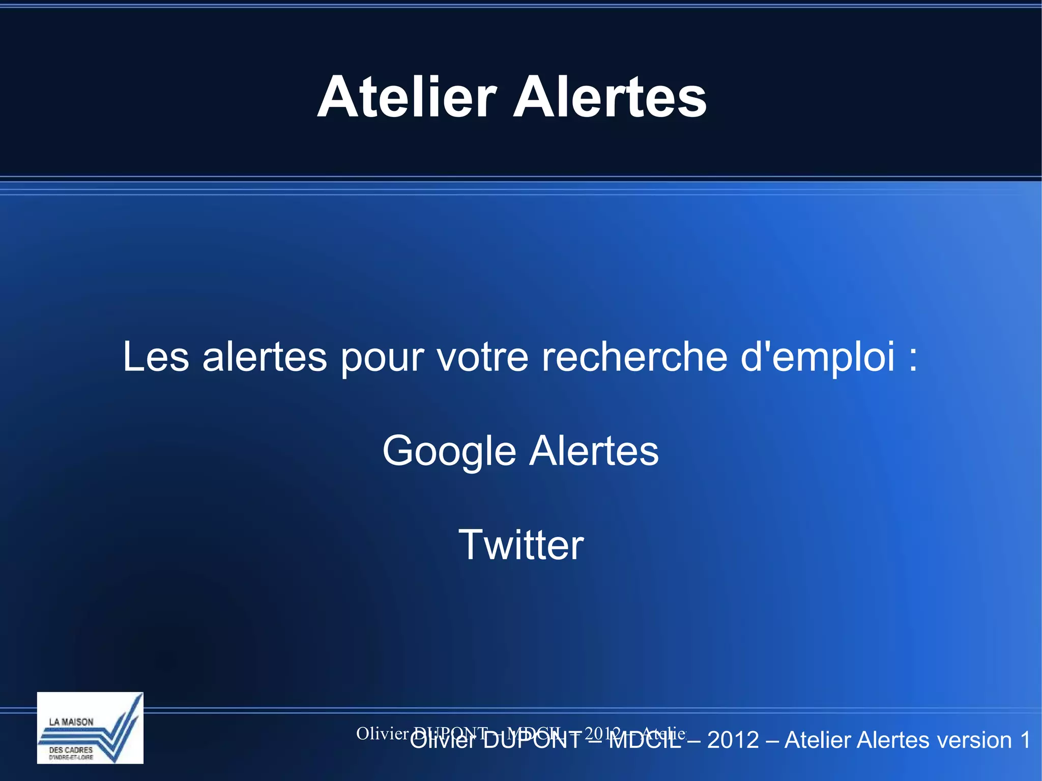 L'atelier sur les alertes pour la recherche d'emploi présente des outils comme Google Alerts et Twitter pour aider les chercheurs d'emploi à recevoir des informations pertinentes. Il décrit les objectifs, la procédure, et les meilleures pratiques pour utiliser ces plateformes efficacement. Des conseils sont également fournis pour optimiser la visibilité et éviter les pièges liés à ces outils.