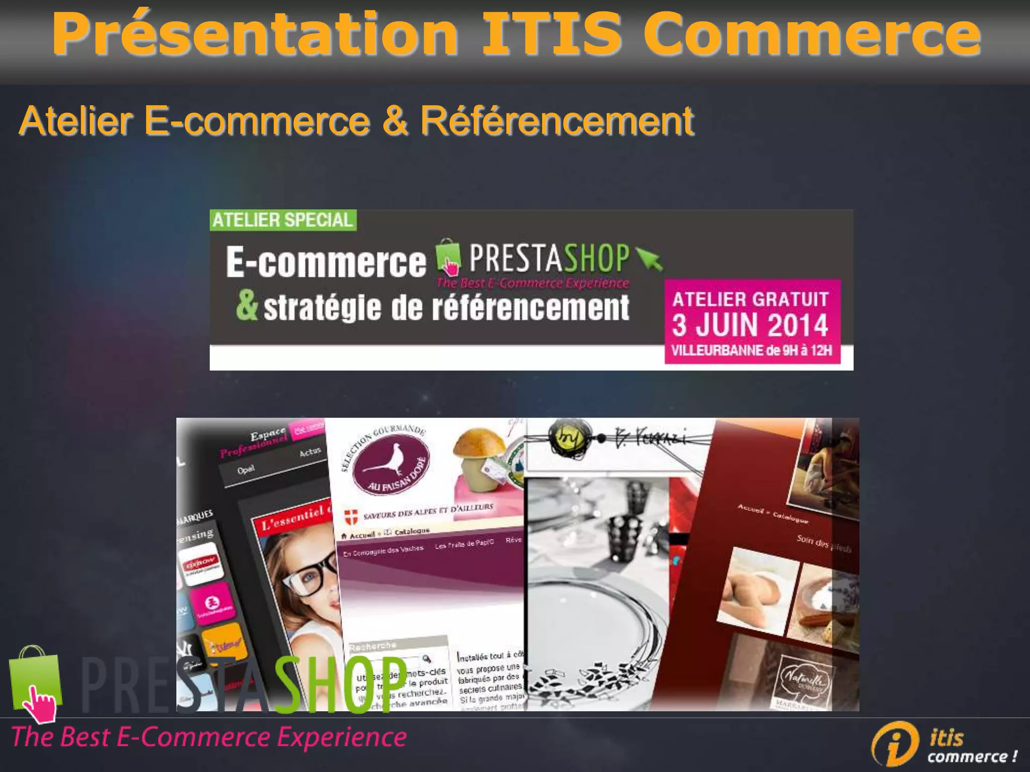 Le document présente les atouts de la solution e-commerce PrestaShop, recommandée par ITIS Commerce pour son efficacité et sa flexibilité. Il décrit également les services offerts par ITIS Commerce et l'écosystème qui permet aux entreprises de créer et gérer leur site internet. Enfin, le document souligne l'importance de la formation et du support pour une mise en œuvre réussie.