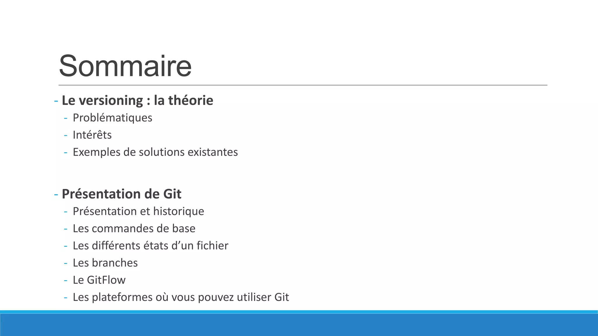 Le document traite des principes du versioning avec Git, en exposant les problématiques rencontrées par les équipes de développement et les solutions qu'offre Git pour le partage de code, la gestion des versions et la résolution de conflits. Il présente également des commandes de base, la création de branches et l'utilisation de plateformes comme GitHub pour la collaboration. Enfin, un atelier pratique est proposé pour appliquer les concepts appris dans un projet collaboratif.