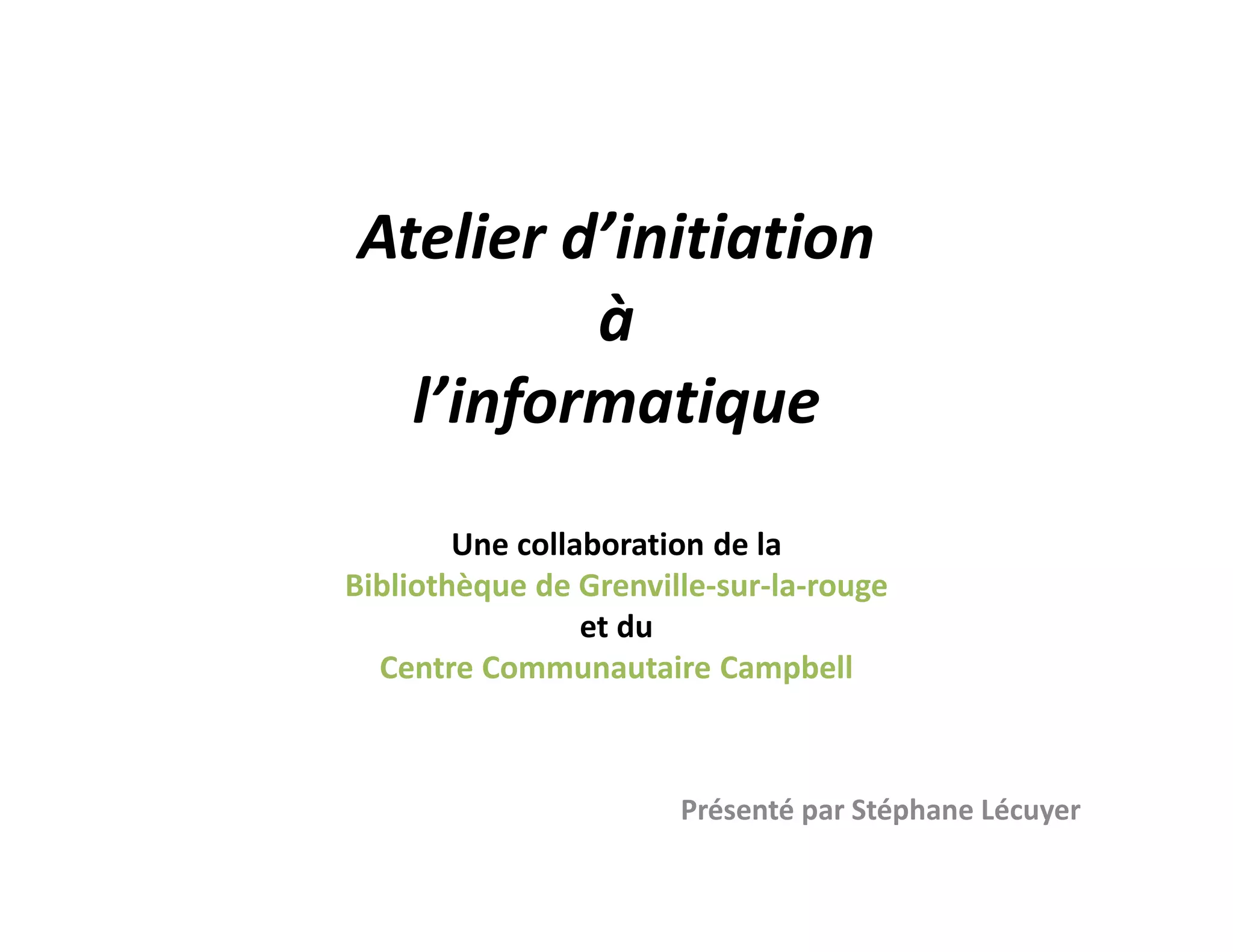 L'atelier d'initiation à l'informatique présente des concepts fondamentaux sur l'Internet, le matériel informatique et la gestion des fichiers, animé par Stéphane Lécuyer, expert en informatique depuis 1986. Il aborde des thèmes tels que les navigateurs, la mesure de la quantité d'informations et l'importance de la sécurité des mots de passe. De plus, l'atelier propose des conseils pratiques pour optimiser les performances des ordinateurs et utilise des exemples concrets pour illustrer les notions abordées.