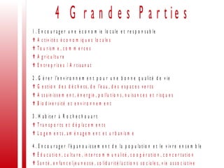 Le chapitre 4 aborde l'épanouissement de la population et le vivre ensemble à Rochechouart, soulignant le manque de services culturels, de lieux de partage et de sensibilisation au développement durable, tout en mettant en avant un tissu associatif dynamique et un joli programme d'événements. Les forces incluent une école labellisée éco-école et des services de proximité, tandis que les faiblesses concernent la diminution des jeunes et le vieillissement de la population. Des orientations sont proposées pour encourager une culture responsable et inclusive, ainsi que pour impliquer davantage les habitants dans le développement communal.