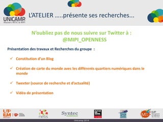 L'atelier explore l'impact de la culture locale sur le développement des quartiers numériques, ainsi que la façon dont l'immobilier d'entreprise peut intégrer ces éléments culturels pour renforcer son identité. Il vise à accroître la visibilité de la French Tech à l'international en développant des outils comme un blog et une carte des quartiers numériques dans le monde. Les recherches portent sur l'interconnexion entre l'immobilier et la culture, tout en proposant des services innovants inspirés de la culture French Tech.
