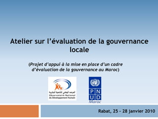 L'atelier sur l'évaluation de la gouvernance locale au Maroc vise à former des participants sur les concepts de gouvernance et à élaborer un cadre d'évaluation adapté aux spécificités locales. Il aborde des thèmes comme la relation entre gouvernance, développement humain, genre, et pauvreté, tout en insistant sur la nécessité d'évaluer la gouvernance au niveau local. L'atelier prévoit également des sessions pratiques pour partager des exemples et définir des indicateurs mesurant la qualité de la gouvernance locale.