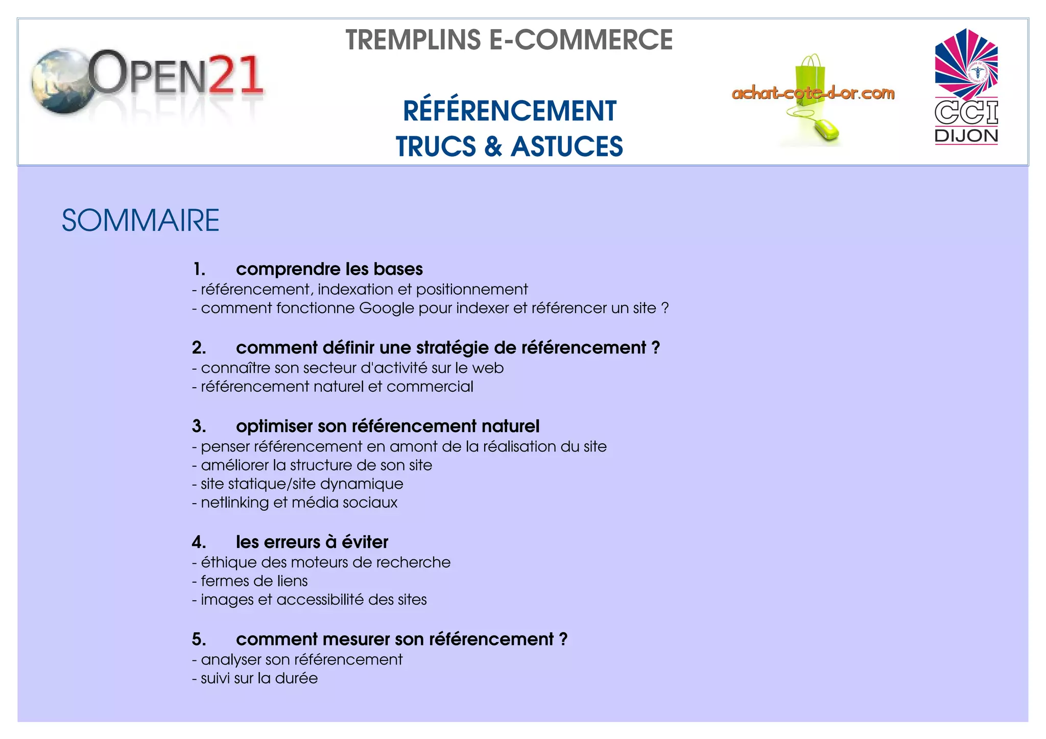 Le document présente les bases du référencement e-commerce, en abordant des sujets tels que l'indexation, le positionnement, et les stratégies d'optimisation. Il décrit les erreurs à éviter, comme l'utilisation de fermes de liens, et met en avant l'importance d'une bonne structure de site et de contenu. Enfin, il fournit des conseils sur la mesure et le suivi du référencement au fil du temps.