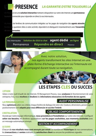 La solution e-presence offre un service de click to chat avec des agents dédiés pour répondre en direct aux questions des internautes sur les sites web. Grâce à un audit personnalisé et une formation des agents, elle permet d'améliorer la satisfaction client, de transformer les visiteurs en clients, et de réduire les abandons de site. L'accompagnement est disponible tous les jours de 8 heures à minuit, garantissant une présence continue et des réponses adaptées.