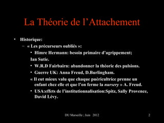Le document traite de la théorie de l'attachement en psychologie, explorant son historique et ses fondateurs, ainsi que les différents modèles éthologiques et analytiques. Il aborde les différentes classifications des styles d'attachement chez les enfants, les implications pour la santé mentale et la résilience, ainsi que les pathologies liées à un attachement déficient. Enfin, il souligne l'importance de la sécurité émotionnelle et de l'interaction parent-enfant pour un développement sain.