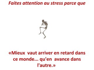 Le document met en évidence les dangers du surmenage au travail en décrivant les caractéristiques d'un accro au travail, comme la négligence de la vie personnelle au profit de la carrière. Il souligne l'importance de trouver un équilibre et de ne pas se laisser submerger par le stress professionnel. La lecture de ce message sert de rappel pour évaluer ses priorités et prendre soin de soi.
