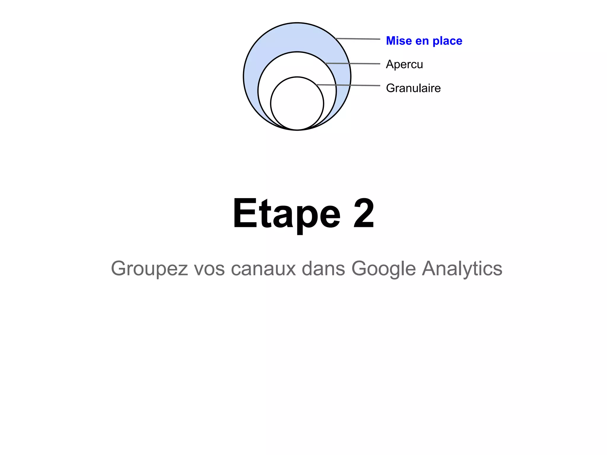 Ce document traite de la étape 2 dans Google Analytics, qui consiste à grouper les canaux pour obtenir un aperçu granulaire des données. Il souligne l'importance du taggage des campagnes pour assurer la qualité des données. Des exemples pratiques sont donnés, notamment un blog et un site e-commerce.
