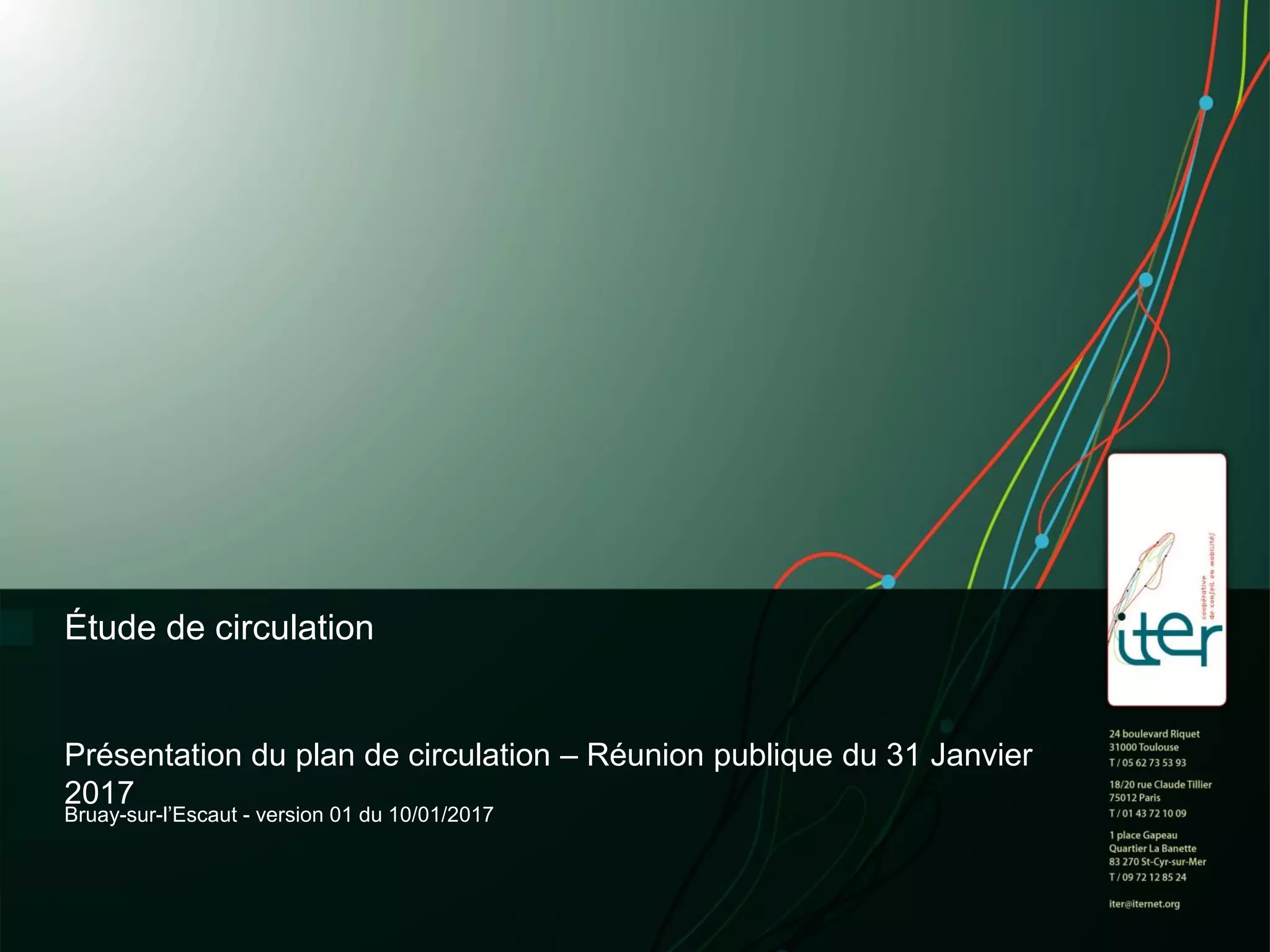 Ce document présente l'étude de circulation de Bruay-sur-l'Escaut, réalisée par la société Iter, qui évalue les flux de véhicules et les problèmes de circulation dans la ville. Les analyses portent sur les volumes de trafic et les dysfonctionnements identifiés, ainsi que sur les propositions de solutions à court terme pour améliorer le fonctionnement des carrefours clés. La réunion publique du 31 janvier 2017 visait à informer les citoyens sur le diagnostic et les évolutions envisagées pour le plan de circulation.