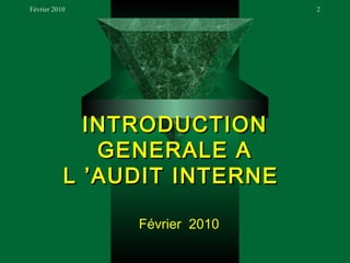 Le document traite de l'audit interne, définissant sa mission et ses caractéristiques principales. Il souligne la distinction entre audit interne et contrôle interne, ainsi que les différents types d'audit. Enfin, il aborde la méthodologie et l'importance d'une charte d'audit pour définir les objectifs et l'étendue des responsabilités de l'audit interne.