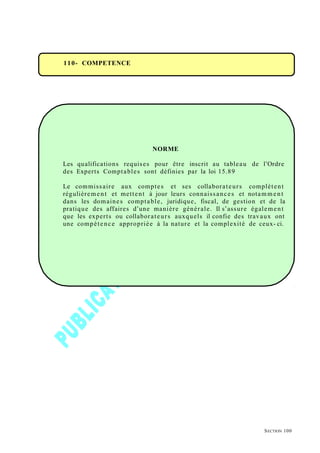 Le document présente les normes de comportement professionnel des commissaires aux comptes, en mettant l'accent sur la compétence, l'indépendance et la qualité du travail. Il souligne l'importance de la formation continue et des critères d'acceptation des missions, tout en régissant le respect du secret professionnel. Les responsabilités et les exigences déontologiques sont également détaillées pour garantir l'intégrité et l'objectivité dans l'exercice de leur mission.