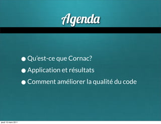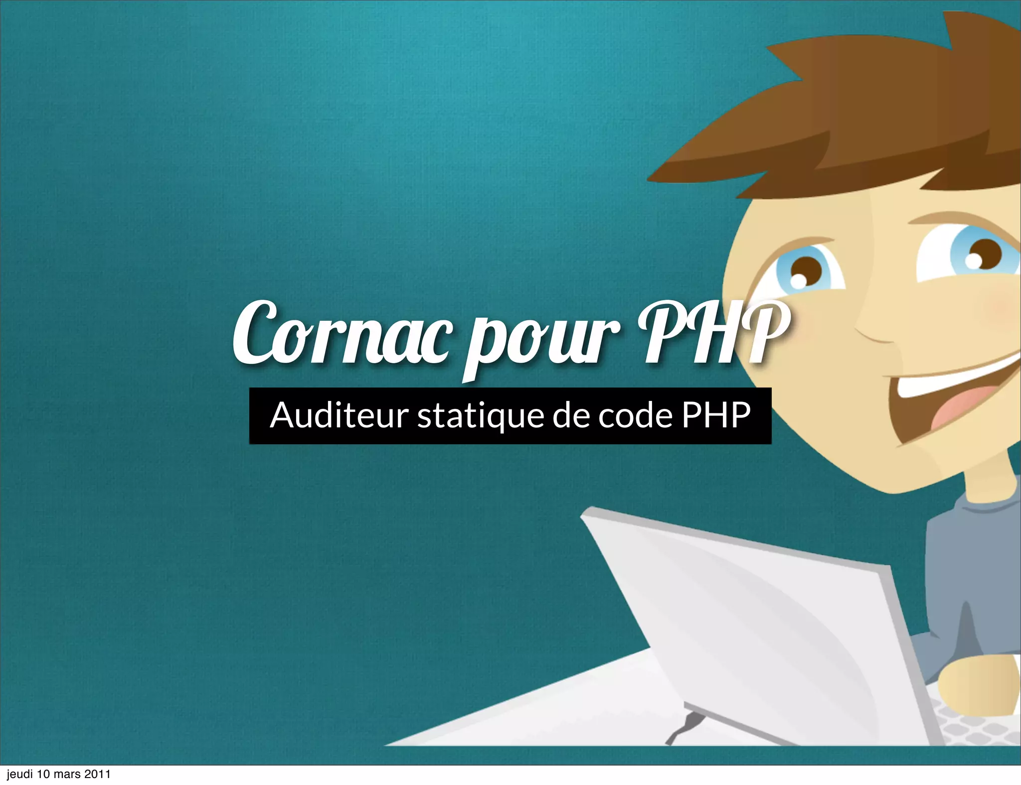 Le document présente Cornac, un auditeur statique de code PHP qui analyse le code sans l'exécuter et identifie les structures, les conventions et les dépendances du code. Il automatise les recherches pour améliorer la qualité du code et peut produire des faux positifs. Ce document aborde également des recommandations sur la sécurité, les conventions, la migration vers PHP 5.3 et d'autres aspects techniques liés au développement PHP.