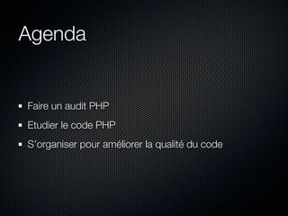 Le document traite des types d'audits PHP, y compris la sécurité, les performances et la qualité du code, avec des méthodes et des outils spécifiques pour chaque approche. Il décrit également l'importance de l'interaction avec les développeurs et propose des stratégies pour analyser le code de manière efficace. Enfin, il souligne l'importance d'audits collaboratifs et de processus d'amélioration continue pour garantir la qualité du code PHP.
