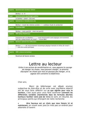 Le document explore divers aspects du bonheur authentique, en discutant des moyens d'évaluer le bien-être subjectif et en présentant des formules et questionnaires pour mesurer le bonheur. Il aborde également l'idée que le bonheur est un choix et peut être cultivé à travers des comportements activement positifs et des relations respectueuses. Enfin, le texte encourage le partage de son contenu et l'adaptation du message sur le bonheur à des contextes culturels spécifiques.