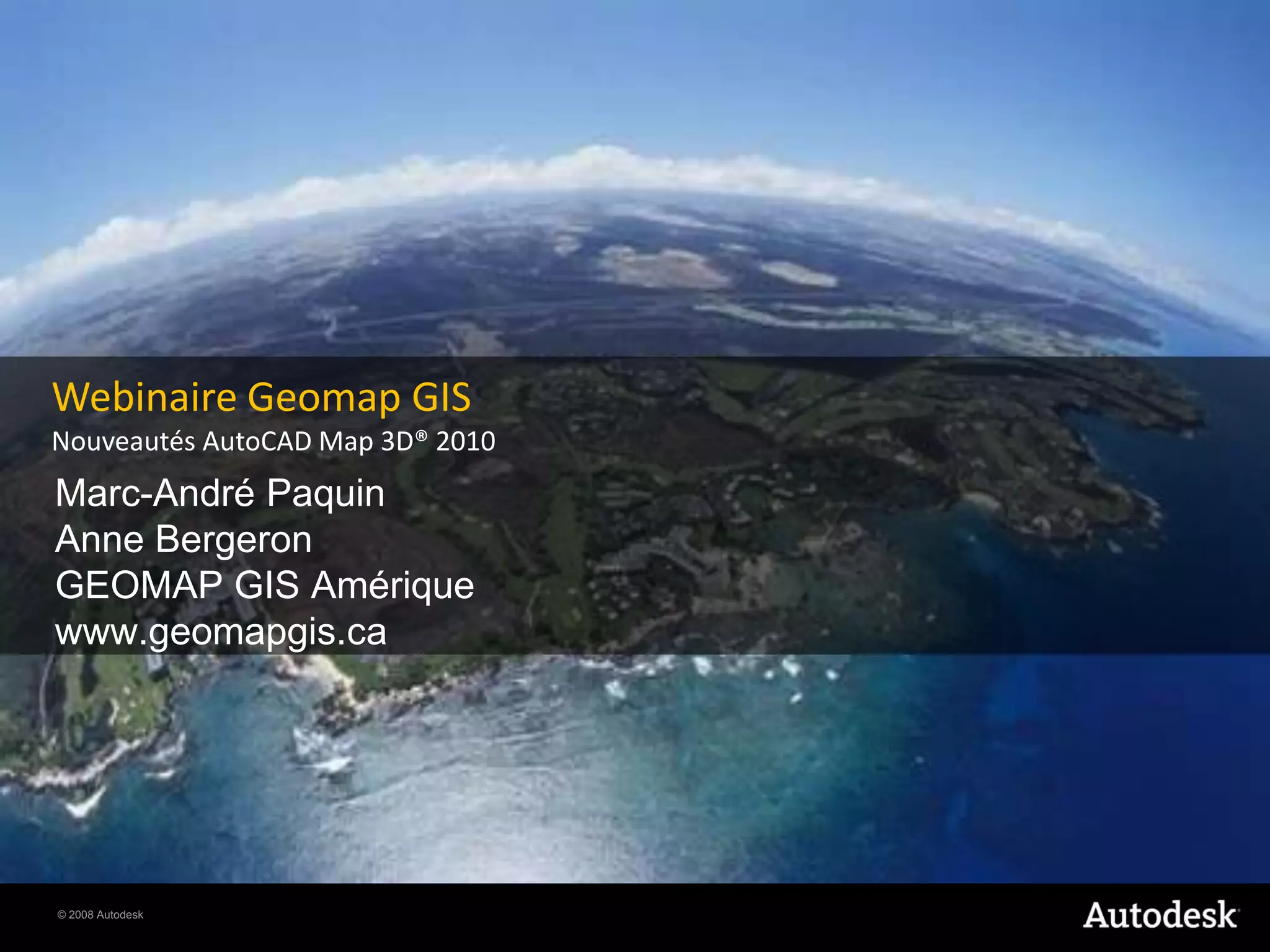 Le document présente les nouveautés d'Autodesk® Map 3D® 2010, notamment une interface améliorée, des options d'importation de données d'arpentage et un moteur de workflow pour automatiser des tâches. Il met également en avant les nouvelles capacités d'analyse de données et d'édition d'objets, ainsi que des améliorations en matière de reprojection et de flexibilité d'installation. Des contacts pour des informations supplémentaires sont fournis à la fin du document.