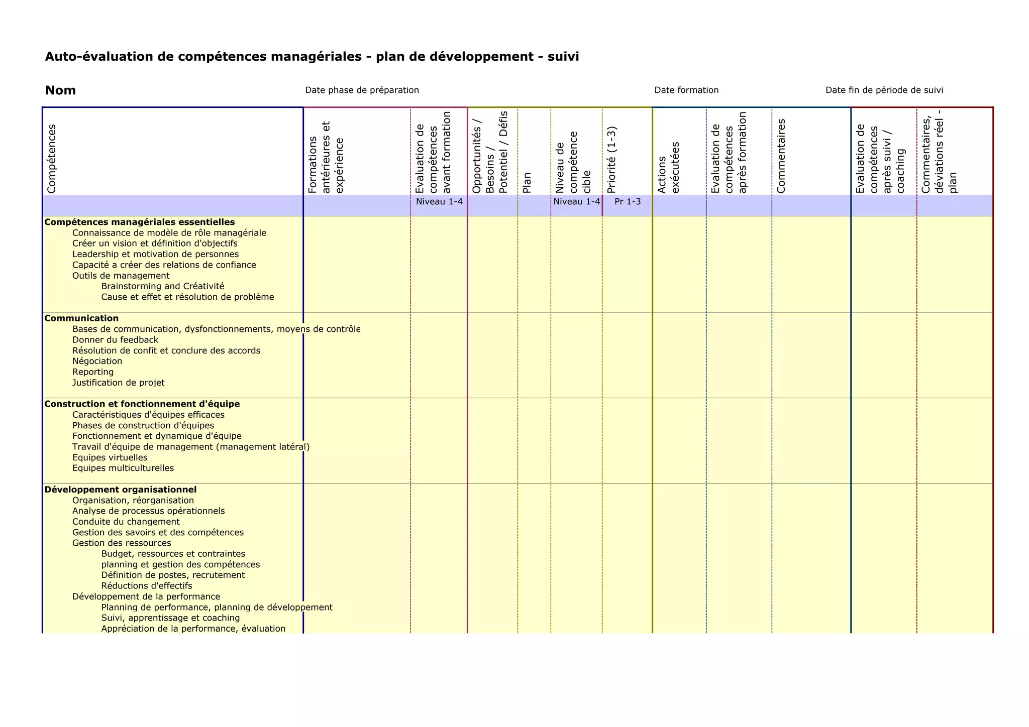 Le document présente un plan d'auto-évaluation des compétences managériales, en détaillant les compétences à développer et les étapes de suivi. Il aborde des thèmes variés tels que le leadership, la gestion du temps, la gestion de projet, et les compétences en communication. L'objectif est d'identifier les déviations entre les compétences réelles et potentielles et de mettre en place un plan de développement efficace.