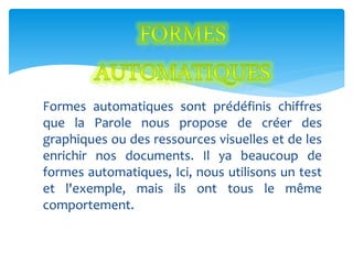 Le document explique l'utilisation des formes automatiques dans un logiciel de traitement de texte, détaillant le processus d'insertion et de manipulation des formes graphiques. Il décrit également comment remplir, modifier le texte et utiliser les différentes options de chaque forme pour enrichir des documents visuels. Enfin, il mentionne la classification des formes automatiques en catégories pour faciliter leur recherche et sélection.
