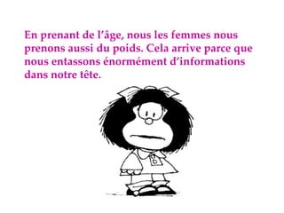 Le document exprime une célébration de la condition féminine, abordant l'idée que la prise de poids chez les femmes avec l'âge est liée à l'accumulation de connaissances et d'expériences. Il souligne l'importance de l'auto-acceptation, tout en mettant en avant les avantages et la force des femmes dans divers aspects de la vie. L'auteur encourage également à apprécier la vie sans se soucier des normes sociétales sur l'apparence.