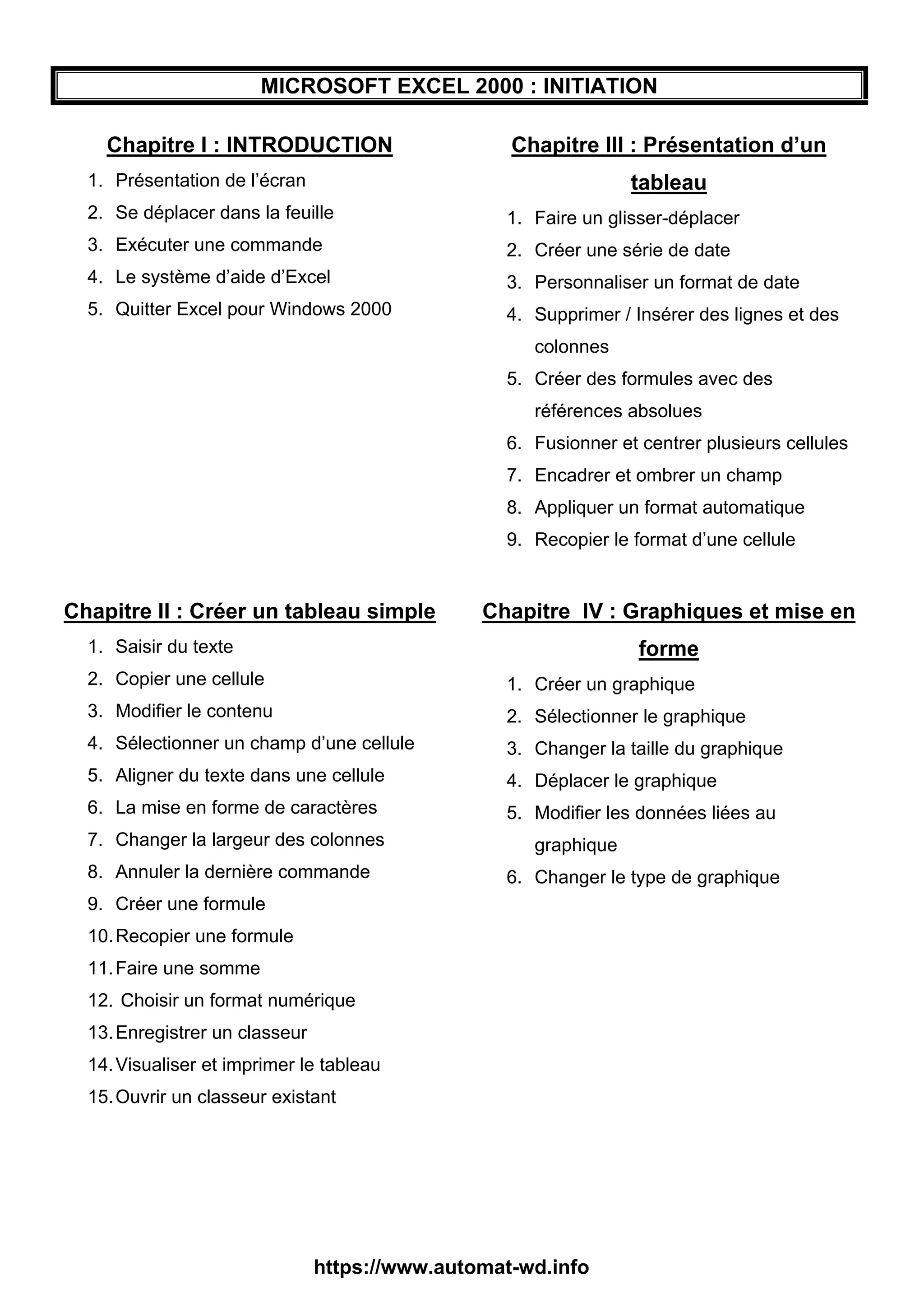 Le document est un guide d'initiation à Microsoft Excel 2000, couvrant la présentation de l'écran, la création de tableaux, l'exécution de commandes et l'utilisation de graphiques. Il explique les opérations de base comme la saisie, la modification de données, la création de formules et l'enregistrement de classeurs. Les chapitres détaillent également les fonctionnalités avancées telles que le formatage et l'impression des tableaux.