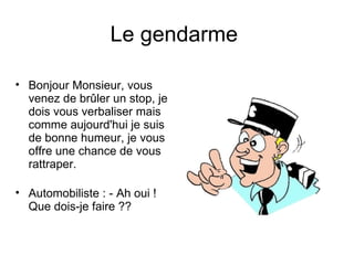 Un gendarme arrête un automobiliste pour avoir brûlé un stop et lui propose de répondre à deux questions pour éviter l'amende. L'automobiliste rate les deux questions en étant trop vague dans ses réponses, ce qui le conduit à être verbalisé. En guise de réponse à une question de l'automobiliste, celui-ci provoque le gendarme avec une blague sur sa famille.
