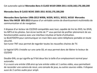 Cet autoradio multimédia pour Mercedes-Benz offre des fonctionnalités avancées telles que la navigation GPS, un écran tactile de 7 pouce, et un lecteur CD/DVD compatible avec divers formats. Il permet également des connexions Bluetooth pour des appels mains-libres, ainsi qu'un tuner TNT pour regarder la télévision en voiture. Compatible avec plusieurs modèles de Mercedes, il inclut de nombreuses options de connectivité et un amplificateur performant.