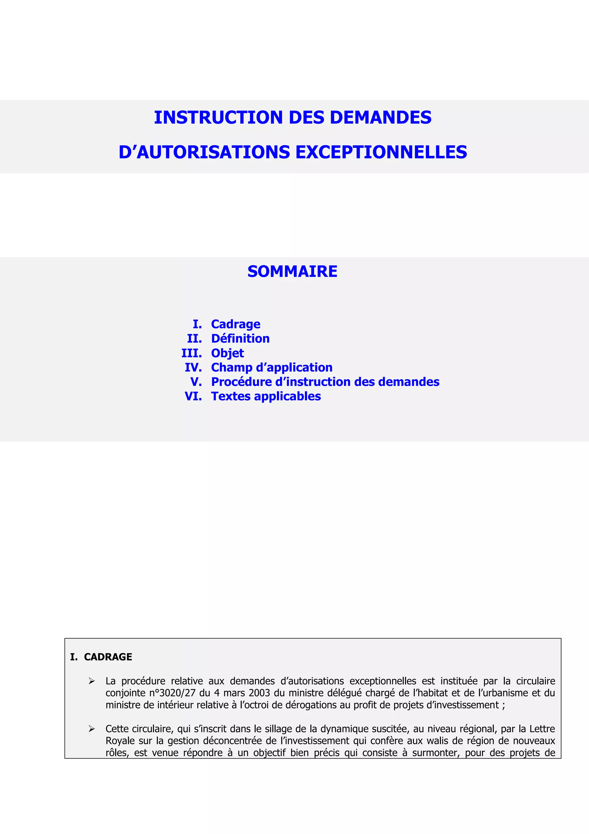Ce document traite de la procédure d'instruction des demandes d'autorisations exceptionnelles pour des projets d'investissement, établie par la circulaire n°3020/27. Il précise le cadre, la définition des autorisations exceptionnelles, leur objectif, le champ d'application, et les conditions d'octroi, ainsi que la composition de la commission responsable de leur évaluation. Finalement, il énonce les textes législatifs et réglementaires applicables à cette procédure.