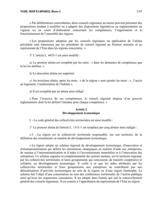 Le projet de loi vise à clarifier l'organisation territoriale en renforçant les responsabilités des régions, notamment en matière de développement économique et de tourisme. Il modifie le code général des collectivités territoriales pour mieux définir les compétences des conseils régionaux et améliorer la coopération entre collectivités. Parmi les mesures notables, il introduit un schéma régional de développement économique et touristique, garantissant l'implication des collectivités dans la mise en œuvre des politiques correspondantes.