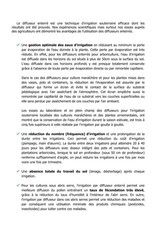 Chahbani Technologies propose des diffuseurs enterrés pour une irrigation souterraine efficace, prouvée par des essais auprès des agriculteurs. Cette technique permet une gestion optimale de l'eau en réduisant l'évaporation, en prolongeant les intervalles d'irrigation et en minimisant les besoins en fertilisants, tout en réduisant l'impact environnemental. Les diffuseurs sont adaptés à divers types de cultures et offrent des avantages supplémentaires, tels que la protection des infrastructures et l'amélioration de la productivité dans des conditions de sécheresse.