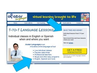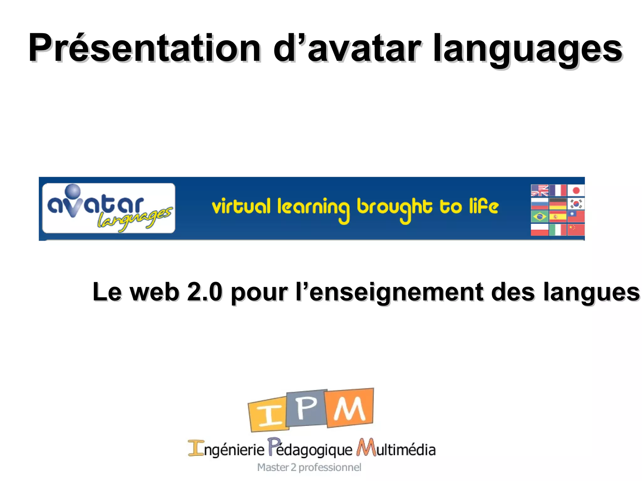 Le document présente Avatar Languages, une approche innovante de l'enseignement des langues axée sur les besoins des apprenants à travers l'utilisation des outils Web 2.0. Il décrit un modèle économique attractif permettant aux enseignants de tirer parti de la baisse des coûts tout en offrant une personnalisation des apprentissages et des interactions en ligne. Les recommandations incluent l'orientation collaborative des devoirs et l'implémentation d'une plateforme LMS pour un meilleur suivi des apprenants.