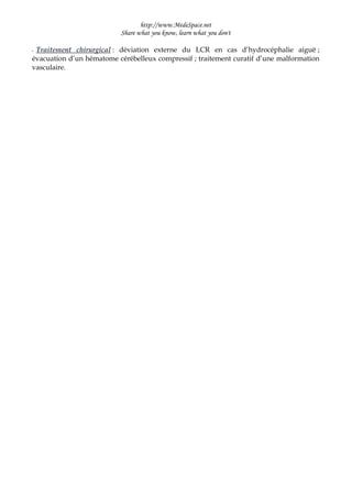 Le document traite des hémorragies cérébrales, en décrivant leurs tableaux cliniques, étiologies, pronostic et traitements. Les hémorragies capsulo-lenticulaire, du carrefour et du cervelet sont abordées avec leurs symptômes caractéristiques et facteurs de risque. Il insiste sur la nécessité d'un traitement médical et chirurgical adapté pour optimiser le pronostic fonctionnel et réduire les complications.