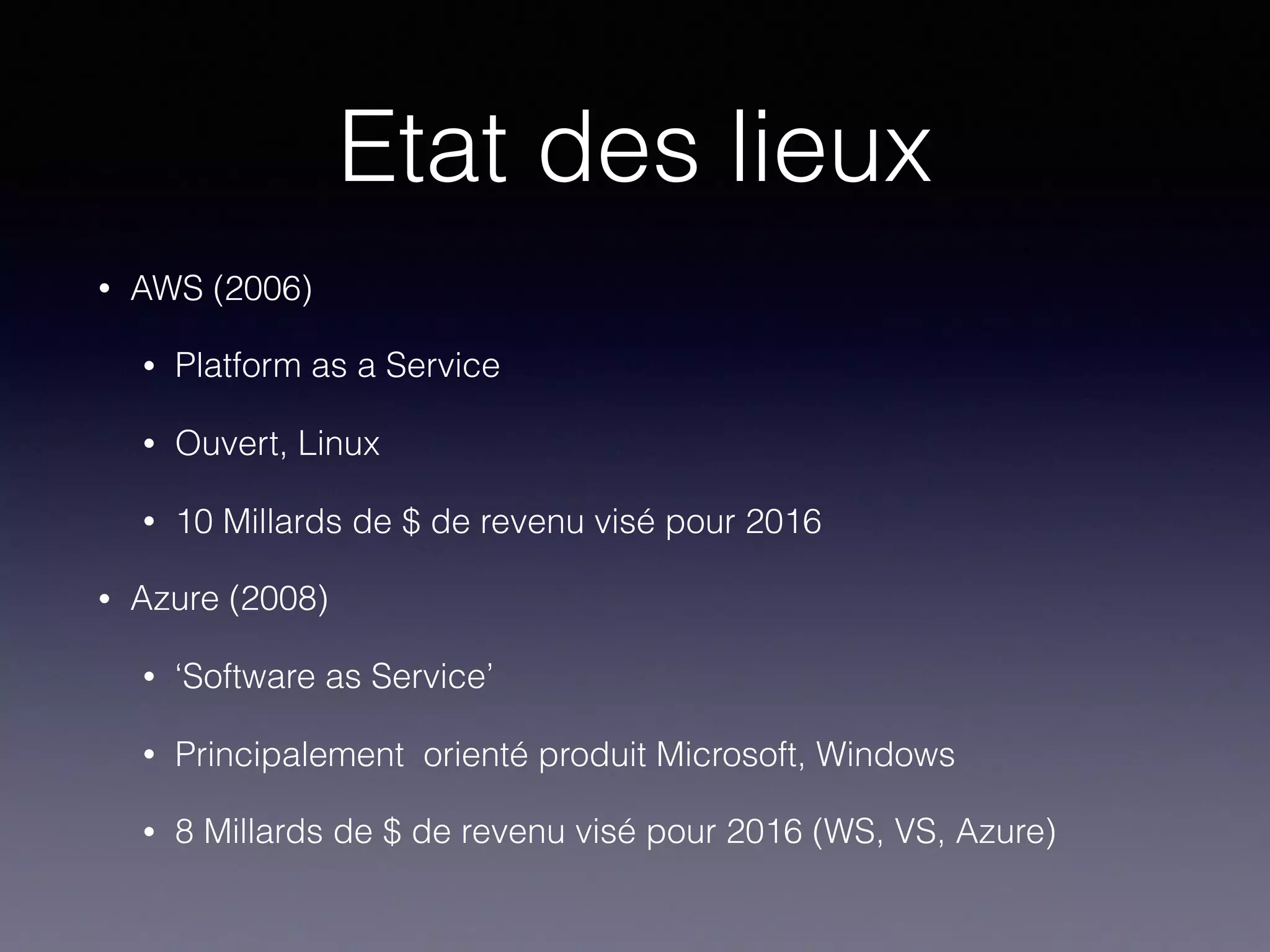 Le document compare AWS et Azure, mettant en lumière leurs modèles économiques, avec AWS visant 10 milliards de dollars en 2016 et Azure 8 milliards. AWS se concentre sur l'architecture réseau et les outils de déploiement, tandis qu'Azure privilégie une intégration avec les produits Microsoft et propose des services guidés. Les deux plateformes évoluent, Azure rattrapant son retard avec une ouverture vers des services non-Microsoft et une réduction potentielle des coûts.