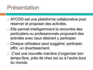 Aycoo est une plateforme collaborative qui permet de réserver et de proposer des activités, connectant ainsi des particuliers et des professionnels. Elle intègre des données de transport en open data pour faciliter l'organisation des sorties. L'équipe de développement prévoit également de lancer un site web pour élargir l'accès à l'application.