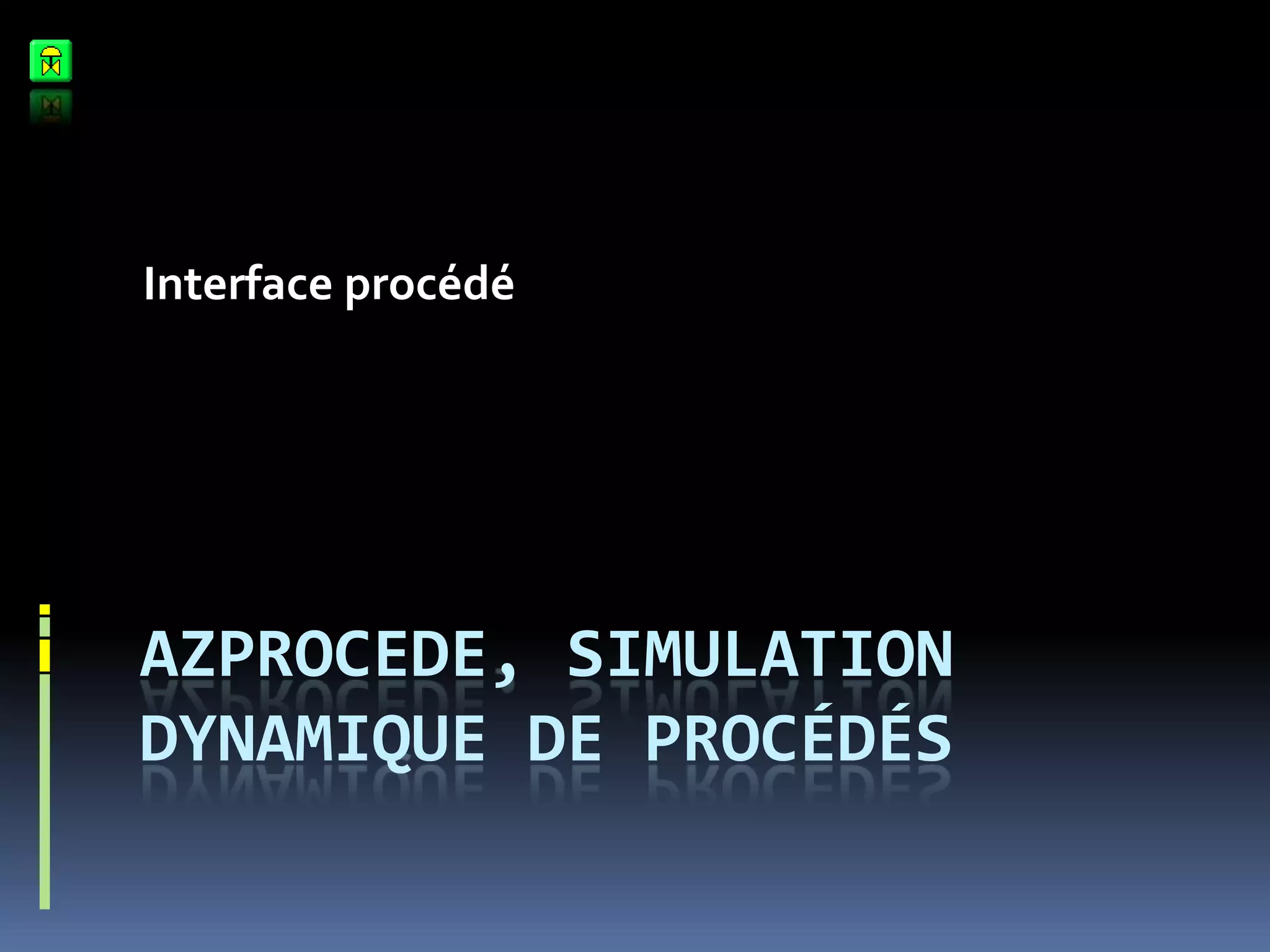 Le document décrit une interface pour la simulation dynamique de procédés, manipulable entièrement à la souris avec des commandes pour démarrer, arrêter et ajuster des valeurs. Il présente différentes fonctionnalités telles que le suivi de l'évolution des mesures, des outils graphiques d'analyse, et des options de configuration pour le dimensionnement de l'installation. Des codes couleurs et des indications de statut facilitent la visualisation des composants et de leur état.