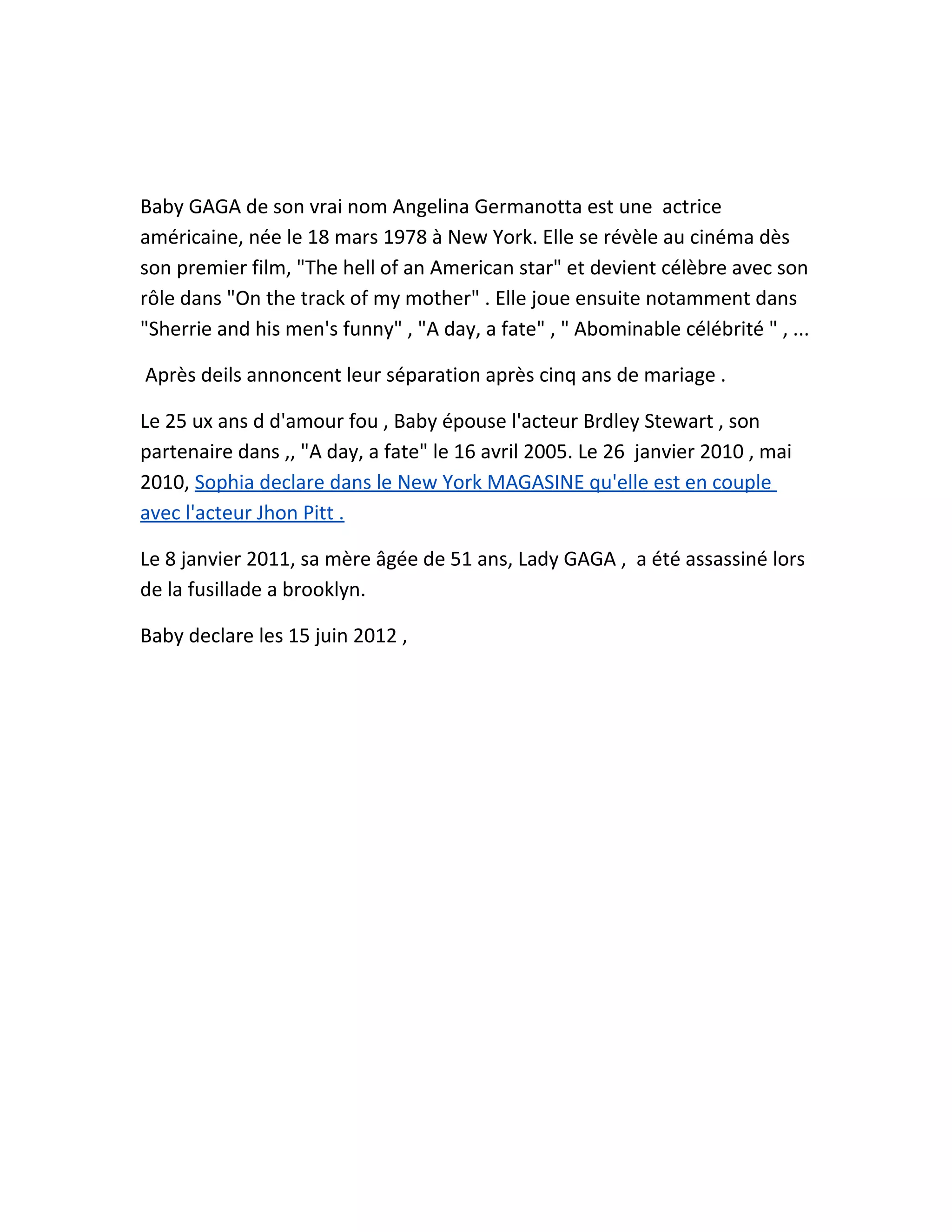 Baby Gaga, de son vrai nom Angelina Germanotta, est une actrice américaine née le 18 mars 1978 à New York, connue pour ses rôles dans plusieurs films. Après une carrière réussie, elle a connu des relations tumultueuses, y compris un mariage avec l'acteur Bradley Stewart. Elle a également subi une tragédie personnelle avec l'assassinat de sa mère en janvier 2011.