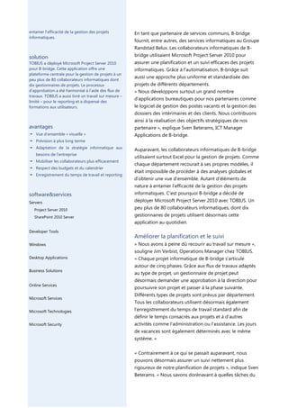 b-bridge a intégré Microsoft Project Server 2010 pour améliorer la gestion de projets, remplaçant des outils comme Excel par une plateforme centralisée permettant une collaboration fluide entre plus de 80 collaborateurs informatiques. Cette optimisation a uniformisé les processus de gestion de projets et a permis un suivi rigoureux des tâches, avec des avantages tels qu'une meilleure planification et une visibilité accrue sur l'état d'avancement. Après neuf mois d'utilisation, b-bridge a constaté une efficacité accrue et une collaboration renforcée avec ses partenaires.