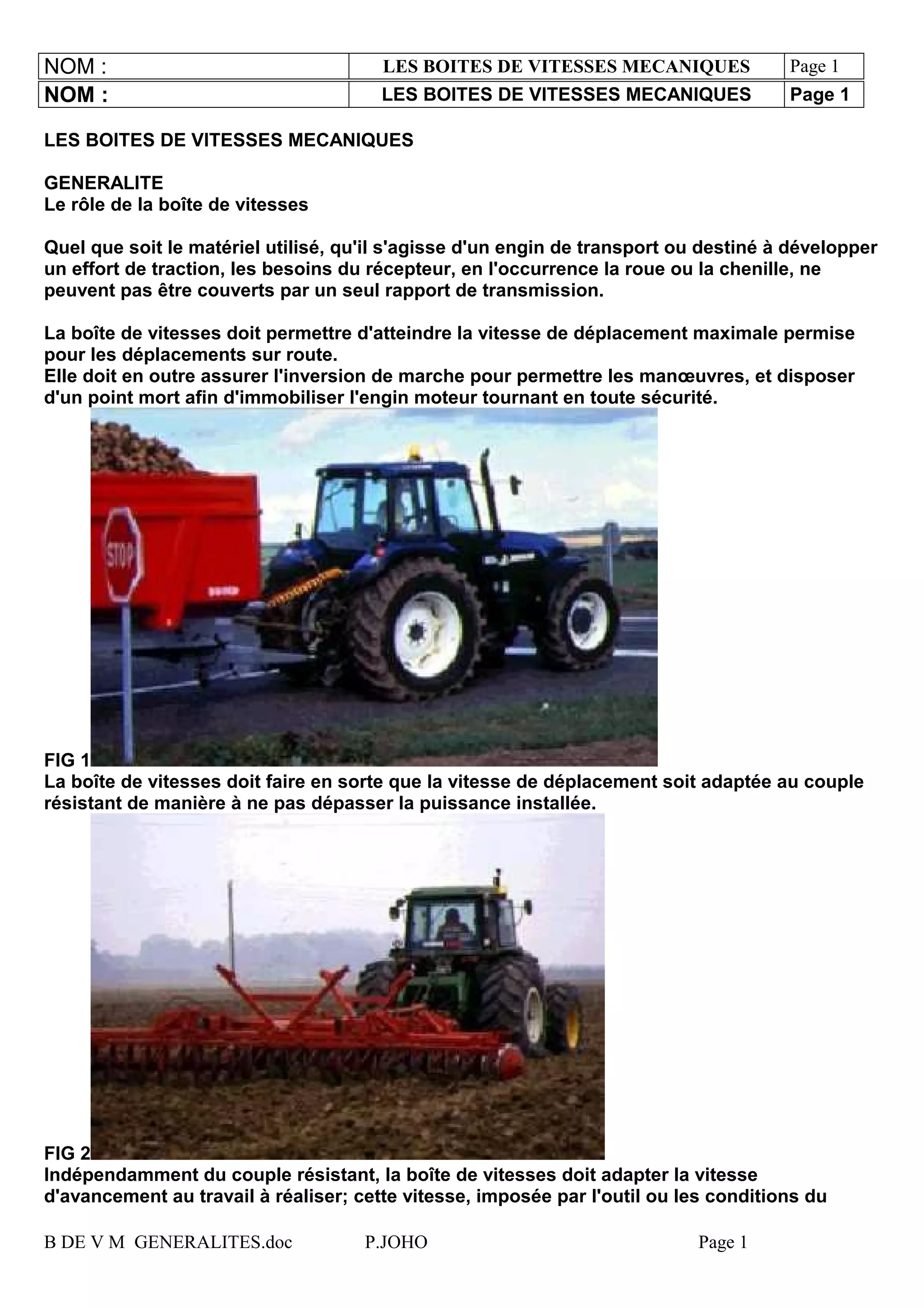 Les boîtes de vitesses mécaniques sont essentielles pour adapter la vitesse et le couple d'un engin de transport, permettant ainsi d'atteindre la vitesse maximale et d'assurer l'inversion de marche. Elles doivent offrir plusieurs rapports de transmission pour faire face aux différentes situations sur le terrain tout en maintenant une consommation réduite. La conception doit répondre aux besoins du milieu et des outils utilisés.