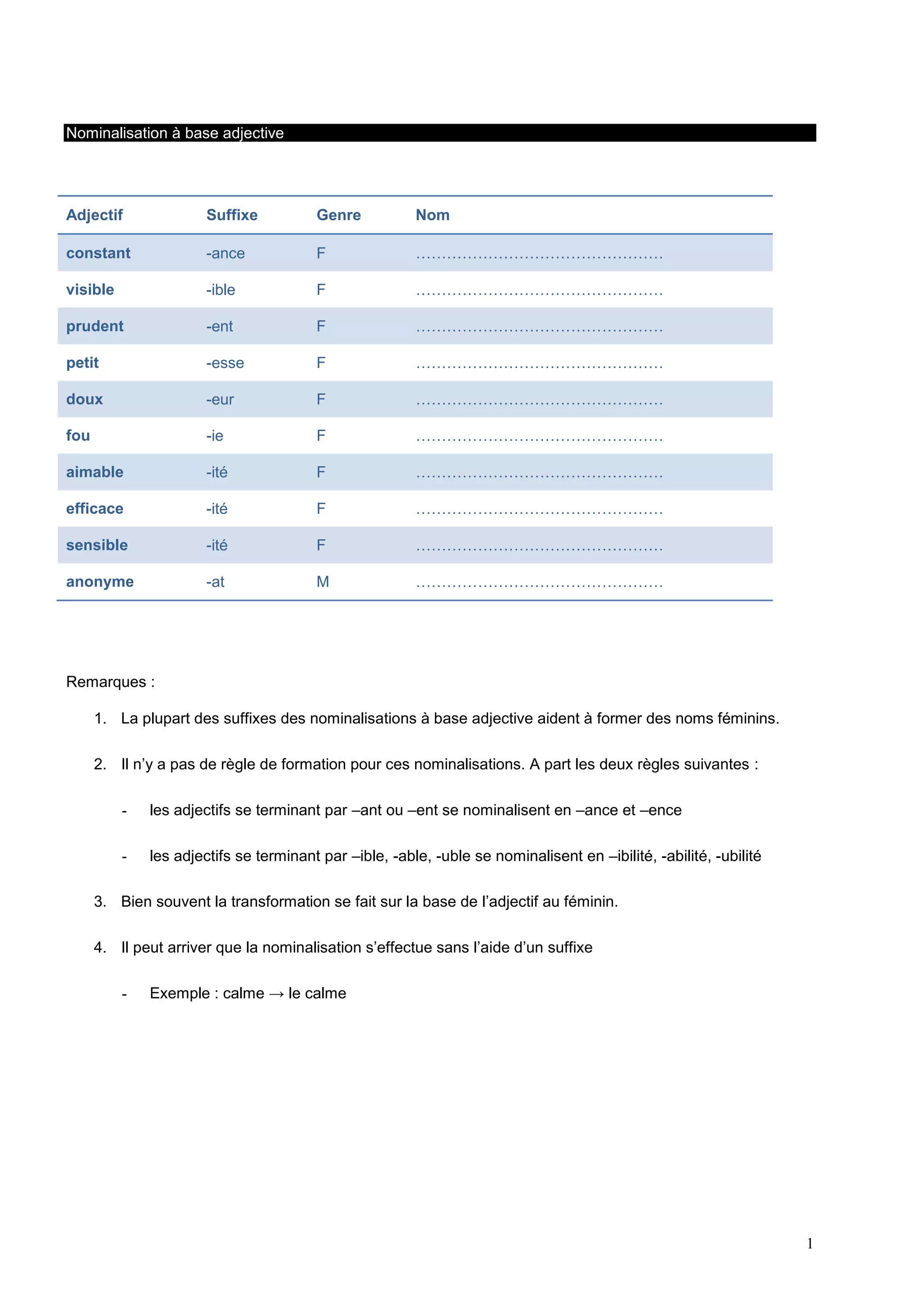Le document traite des règles de nominalisation en français basées sur les adjectifs et verbes, détaillant les suffixes utilisés pour former des noms féminins et masculins. Il inclut également des exercices pratiques pour transformer des phrases en groupes nominaux et des exemples de transformation de phrases complexes en phrases simples. Enfin, le document propose de créer des publicités pour divers secteurs en se basant sur le thème de l'évasion et du plaisir.