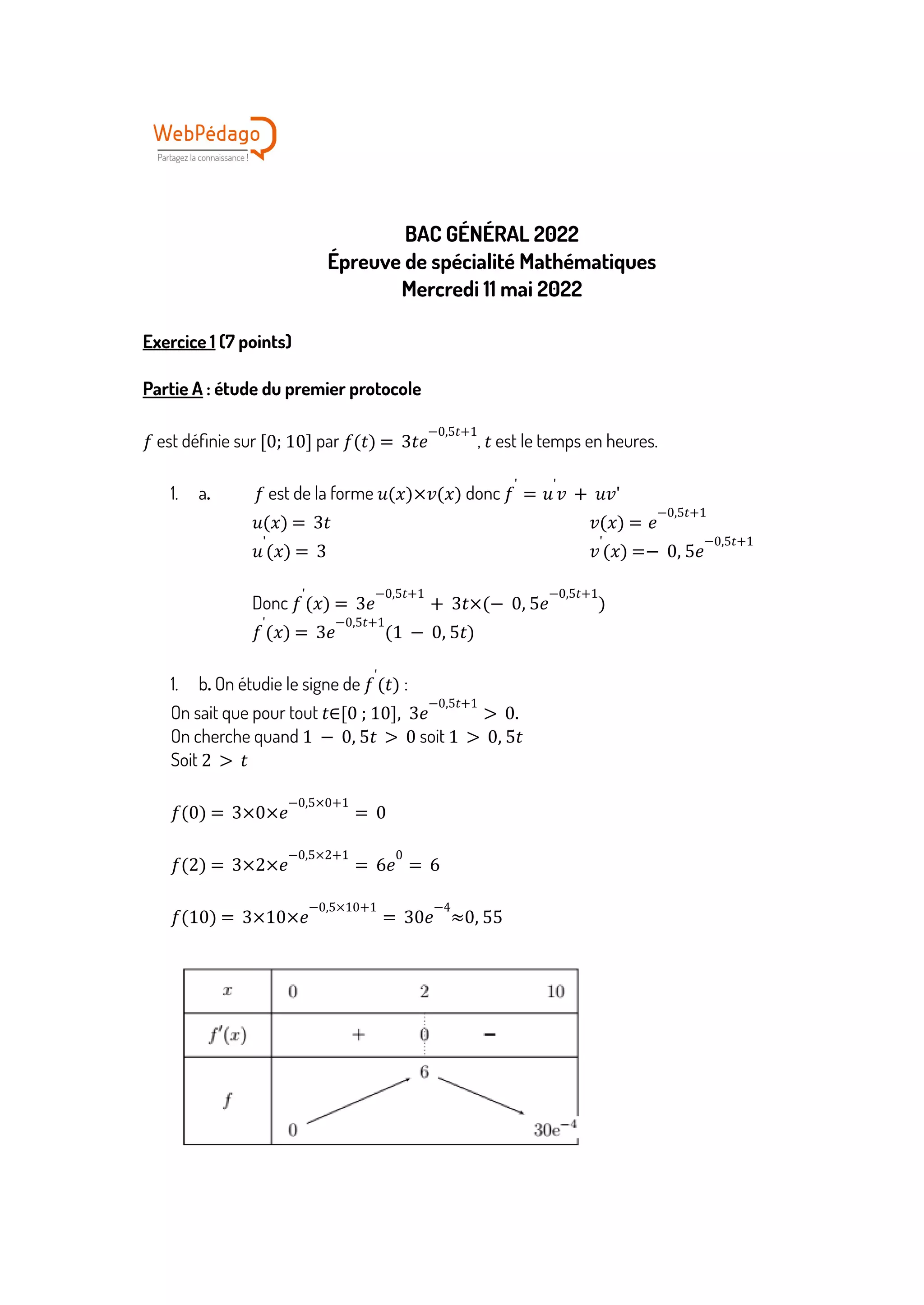 Le document traite des épreuves de mathématiques du bac général de 2022, en se concentrant sur des protocoles de dosage de médicaments. Il présente l'analyse de la fonction représentant la quantité de médicament dans le temps, les propriétés de convergence d'une suite, ainsi que des problèmes d'analytique géométrique. Les résultats incluent le temps optimal de traitement et la limite de la quantité de médicament au bout d'un certain nombre d'heures.