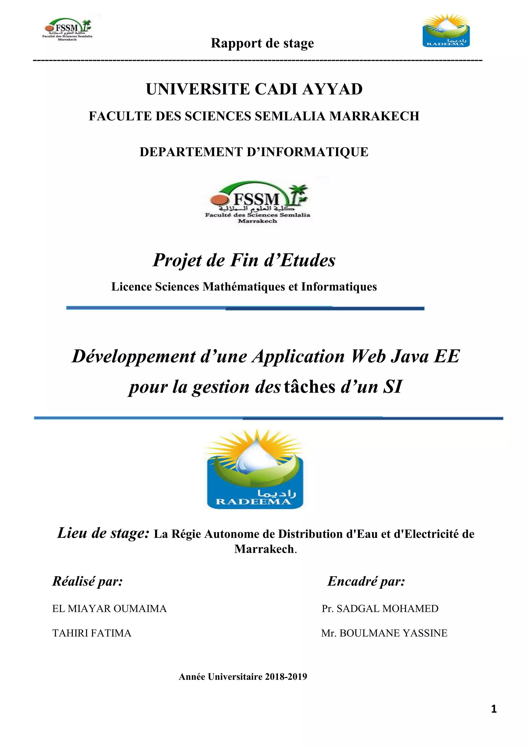 Ce rapport détaille un stage de deux mois à la Régie autonome de distribution d'eau et d'électricité de Marrakech, visant à développer une application web en Java EE pour la gestion des tâches d'un système d'information. Le projet se concentre sur la gestion de tâches planifiées et non planifiées, en utilisant JPA pour la persistance des données. Le document présente également l'analyse des besoins, la conception et la mise en œuvre de l'application.