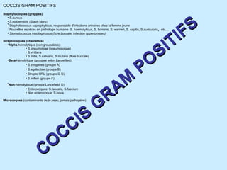 Le document présente une classification des bactéries en fonction de leur Gram, incluant des coccis positifs et négatifs, ainsi que des bacilles et des bactéries anaérobies. Il décrit différents genres et espèces, soulignant leur implication dans diverses infections humaines. Enfin, il mentionne des bactéries intrinsèquement résistantes et celles sans paroi cellulaire.