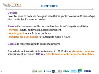 Le pôle thématique Theia est une initiative française visant à faciliter l'accès à l'imagerie satellitaire pour la communauté scientifique et les acteurs publics, en fédérant les efforts de plusieurs institutions. Il vise à développer des infrastructures de données et des méthodes autour de l'observation des surfaces continentales, tout en garantissant un accès gratuit et une mutualisation des données. Theia promet également de répondre aux défis environnementaux et sociétaux à travers des projets collaboratifs et des initiatives internationales.