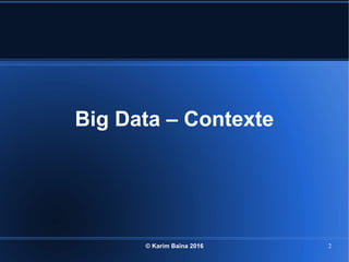Le document aborde le concept de big data, soulignant les défis et opportunités associés à son volume, sa vélocité, sa variété et sa véracité. Il présente également des cas d'utilisation pratiques, tels que la sécurité urbaine et l'analyse des sentiments sur les réseaux sociaux, ainsi que les stratégies de traitement des données. Enfin, le document discute des compétences nécessaires pour devenir spécialiste en big data et souligne les bénéfices potentiels pour le Maroc.