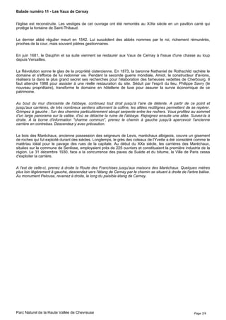 La balade numéro 11 traverse les Vaux de Cernay, mettant en avant l'abbaye historique et l'ancienne carrière des maréchaux, révélant l'histoire riche de ces sites depuis le XIIe siècle jusqu'à leur réhabilitation récente. Ce parcours de 9 km propose des vues panoramiques et des sentiers variés, tout en permettant d'explorer le patrimoine naturel et culturel de la Haute Vallée de Chevreuse. Les vestiges de l'abbaye et la mémoire des carrières témoignent d'une époque où ces lieux étaient florissants avant leur déclin.