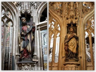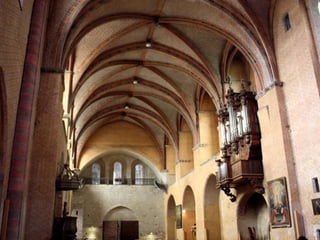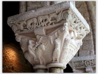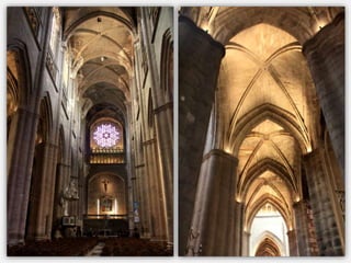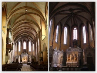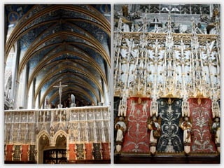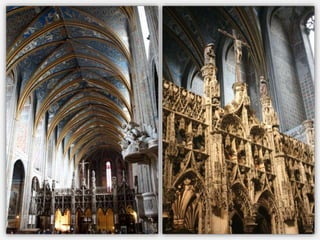 Le document présente un itinéraire historique à travers Rodez, Conques, Albi et Moissac, mettant en avant des églises et cathédrales remarquables telles que la cathédrale Notre-Dame de Rodez et l'abbatiale Sainte-Foy de Conques. Chaque site est décrit en termes de style architectural, d'histoire, et d'éléments artistiques significatifs, tels que des sculptures et retables. La synthèse souligne l'importance religieuse et culturelle de ces lieux tout en abordant des détails architecturaux distinctifs.