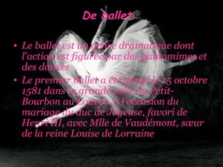 Le ballet, un genre dramatique alliant pantomime et danse, a fait ses débuts le 15 octobre 1581 lors d'un mariage royal. Karen Kain, danseuse emblématique, a exprimé son amour pour le ballet malgré les défis rencontrés, affirmant que cette discipline développe le caractère et l'attitude des jeunes filles. Elle a pris sa retraite en 1996 après une carrière riche, restant passionnée par la danse et son impact.