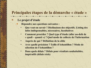 Le document décrit le processus d'une étude de marché, incluant la définition du problème, la collecte d'informations et l'analyse des résultats pour formuler des recommandations. Il aborde également la conception du questionnaire, la sélection de l'échantillon et la méthode d'analyse des données, tout en identifiant les problématiques courantes à éviter. Enfin, des études de cas et des conseils pratiques sont fournis pour garantir l'efficacité des études de marché.